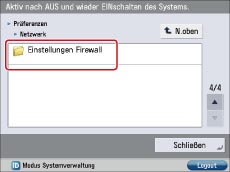 → Berühren Sie nacheinander die Tasten [Präferenzen] → [Netzwerk] → [Einstellungen Firewall].