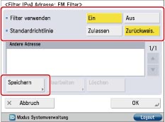 Berühren Sie die Taste [Ein] für <Filter verwenden> → Berühren Sie die Taste [Zurückweisen] für <Standardrichtlinie> → Berühren Sie die Taste [Speichern].