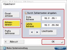 Berühren Sie die Taste [Adressbereich] → Berühren Sie die Taste [Erste Adresse] und geben Sie mit den Zahlentasten auf dem Bedienfeld '192.31.255.1' ein → Berühren Sie die Taste [Letzte Adresse] und geben Sie '192.31.255.254' ein→ Bestätigen Sie durch Berühren der Taste [OK].