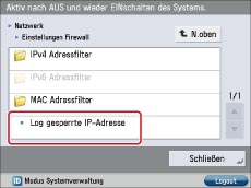 → Berühren Sie nacheinander die Tasten [Präferenzen] → [Netzwerk] → [Einstellungen Firewall] → [Log gesperrte IP-Adresse].