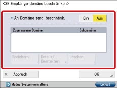 → Berühren Sie nacheinander die Tasten [Einstellungen Funktion] → [Senden] → [Einstellungen E-Mail/I-Fax] → [SE Empfängerdomäne beschränken]