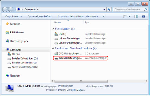 Klicken Sie nacheinander auf [Start] → [Computer] → Wählen Sie das Speichermedium.