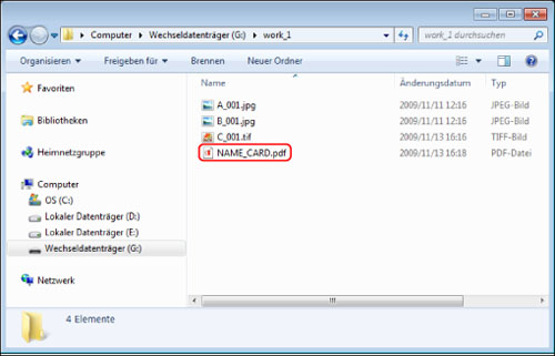 Die gescannten Visitenkarten können an unterschiedlichen Speicherordner abgelegt werden, etwa im Erweiterten Platz eines anderen Systems im Netzwerk oder auf einem Speichermedium.