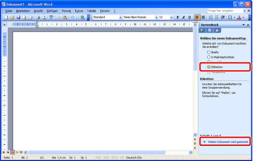 Wählen Sie bei [Wählen Sie einen Dokumenttyp] die Option [Etiketten] → Klicken Sie auf [Weiter].
