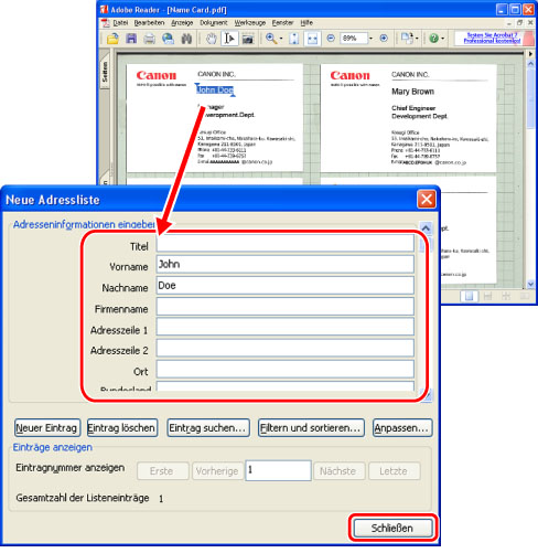 Nachdem Sie die Daten für alle Visitenkarten eingegeben haben, klicken Sie auf [Schließen].