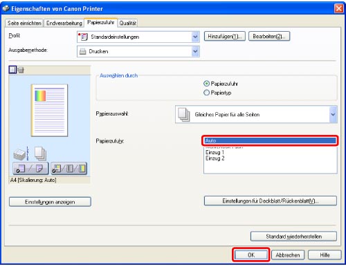 Klicken Sie auf die Registerkarte [Papierzufuhr] → Wählen Sie die Papierzufuhr, die Etiketten enthält → Klicken Sie auf [OK].
