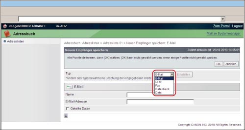 Sie können diese Aufgabe über das Sensordisplay oder das Remote UI ausführen. Über das Remote UI ist das Speichern eines Empfängers besonders einfach.