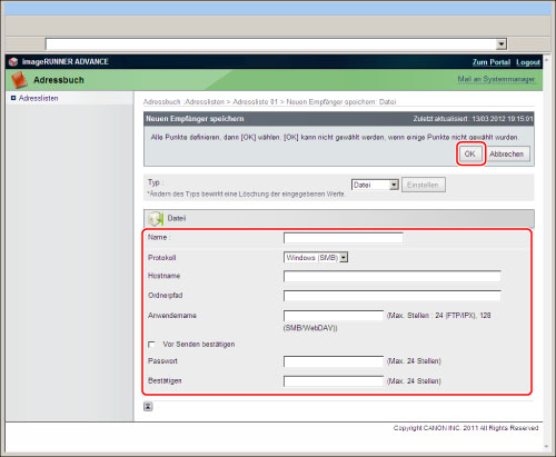 Definieren Sie auf dem Bildschirm [Neuen Empfänger speichern: Datei] die gewünschten Einstellungen → Klicken Sie auf [OK].