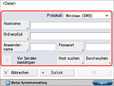 Wenn Sie einen Ordner mit dem Namen "Temporär" im PDF-Scan-Ordner erstellen möchten, geben Sie '\Temporär' ein. Ein Senden ohne Eingabe in diesem Feld ist möglich.