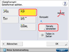 Wählen Sie [PDF] → Berühren Sie die Taste [Details einstellen].