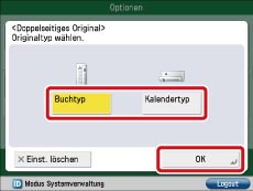 Berühren Sie die Taste [Doppelseitiges Original] → Definieren Sie den Typ des doppelseitigen Originals → Bestätigen Sie durch Berühren der Taste [OK].