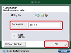 Berühren Sie die Taste [Dateiname] → Geben Sie über die Tastatur den Dateinamen ein → Berühren Sie [OK].