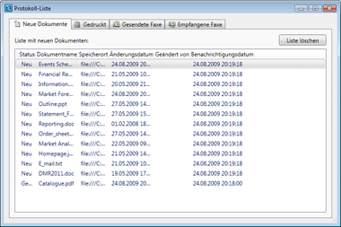 Durch Klicken auf das Symbol für Benachrichtigung über neue Dokumente [Protokoll-Liste] im Benachrichtigungsfenster für neue Dokumente wird das Fenster [Protokoll-Liste] angezeigt. Doppelklicken Sie im Dialogfeld [Protokoll-Liste] auf einen Eintrag in der neuen Dokumentenliste, um Desktop Browser zu starten und die Elemente des Ordners, in dem ein neues Dokument vorhanden ist, im Dateilisten-Ansichtsbereich anzuzeigen.