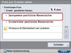 → [Einstellungen Funktion] → [Allgemein] → [Einstellungen Druck] → [Einstellungen geschütztes Wasserzeichen] → [Zwangsweise geschütztes Wasserzeichen].