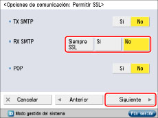 Si selecciona [Sí] para <RX SMTP>, sólo se permitirá la recepción de datos cifrados mediante SSL cuando exista una solicitud desde el host.