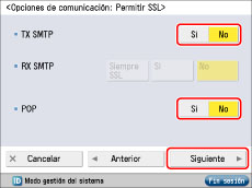 Para cifrar los datos mediante SSL, seleccione [Sí] en <TX SMTP> o <POP>.