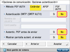 Pulse [No] para <Autenticación SMTP (SMTP AUTH)> → [Sí] para <Autentic. POP antes de enviar>.