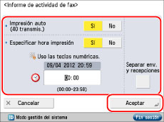 Si está desactivada la opción [Mostrar registro] en [Opciones de gestión] (Configuración), no aparece [Informe de actividad de fax].