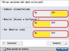 en la parte superior derecha de la pantalla, se muestra la siguiente pantalla. Seleccione las opciones en la pantalla mostrada y establezca la visualización de la pantalla Menú principal.