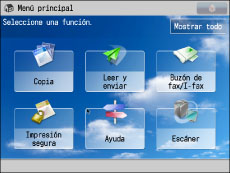 Si pulsa [Mostrar todo] en la pantalla Menú principal, todos los botones aparecen en el orden prefijado aunque haya cambiado la disposición de dichos botones. Para volver a la pantalla personalizada, pulse de nuevo [Mostrar todo].