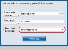 Si se ha establecido Autenticación de dispositivo local como sistema de autenticación de usuarios, sólo aparece [Este dispositivo] en la lista desplegable <Dest. inicio de sesión>.