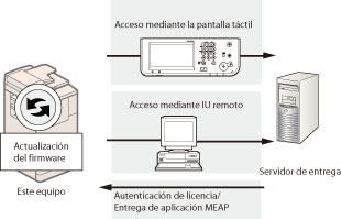 Puede actualizar el firmware del equipo a la versión más reciente con la función "Registrar/Actualizar software". Puede utilizar esta función tanto desde la pantalla táctil como desde el ordenador (IU remota).
