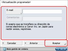 Si se activa la actualización programada, la actualización de firmware se instala a la hora especificada una vez descargado el nuevo firmware del servidor de entregas. Cuando acaba la instalación, el equipo se reinicia automáticamente.