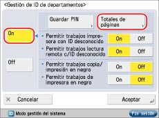 Los totales de páginas que pertenecen a trabajos de impresión sin ID de departamento (dejado en blanco) son el número total de informes del contador, de documentos de fax/I-fax recibidos e impresiones hechas desde ordenadores que no corresponden a ningún ID de departamento guardado. Estas impresiones se denominan impresiones con ID desconocidos.