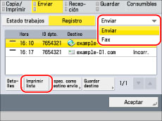 Para imprimir el historial de envíos para el informe de actividad de fax, seleccione [Fax] en la lista desplegable. (Consulte "INFORME DE ACTIVIDAD TX/RX FAX".)