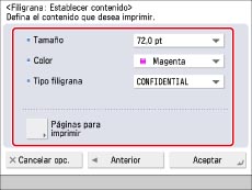 Asimismo, puede seleccionar texto que se haya guardado en [Guardar caract. para numerar págs/Filigrana].(Consulte "Guardar/editar/eliminar texto definido por el usuario para números de página y filigranas".)