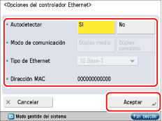 Pulse [Opciones del controlador Ethernet] para [Red] → especifique las siguientes opciones → pulse [Aceptar].