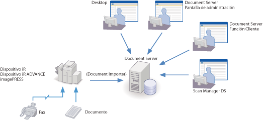 Document Server es un servidor de gestión de documentos que utiliza Document Server Client Function o Desktop como cliente. Además de los documentos creados utilizando estos clientes, también se pueden almacenar documentos escaneados a través de la red, como, por ejemplo, desde la serie iR de dispositivos digitales multifunción y la serie DR de escáneres de documentos. Esto permite crear un sistema de gestión de documentos muy funcional para gestionar los documentos almacenados de manera eficiente.