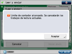 .Puede especificar el límite de páginas entre 0 y 999,999. Una vez alcanzado un límite de páginas, no es posible copiar, leer, imprimir. Al alcanzar el límite de páginas aparece la siguiente pantalla.