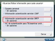 Utiliza la información para autenticación de servidor SMTP establecida en el equipo. (Consulte "Opciones de comunicación comunes para e-mail/I-fax".) No se requieren más ajustes para cada usuario.
