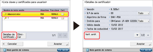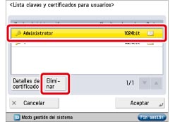 Para información acerca de cómo un usuario general puede mostrar el certificado de usuario, consulte "Comprobar un certificado de firma de dispositivo/firma de usuario". No obstante, en este caso sólo se muestra el certificado de usuario para el usuario que ha iniciado sesión. No es posible mostrar los certificados de usuario de los otros usuarios. Tampoco se puede eliminar el certificado de usuario en esta pantalla. El usuario general debe usar la IU remota para eliminar su certificado de usuario. (Consulte "Instalar un archivo de certificado".)