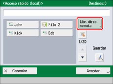 Para utilizar los botones de acceso rápido de un equipo servidor, es necesario configurar las opciones del equipo servidor. Establezca abrir externamente la libreta de direcciones remota en el equipo servidor. Para obtener más información, consulte los manuales del usuario de otros equipos de la serie imageRUNNER ADVANCE.