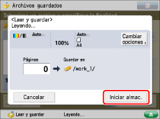Si aparece la siguiente pantalla después de leer el último lote de originales, pulse [Iniciar almac.].