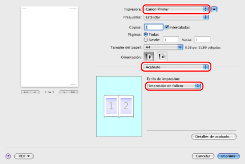 Seleccione su impresora → [Acabado] → [Impresión en folleto] en [Estilo de impresión].