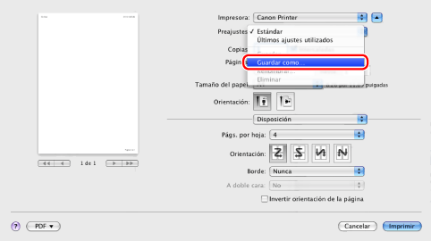 Para editar un preajuste, en el cuadro de diálogo [Imprimir] seleccione el preajuste → especifique los ajustes del controlador de impresora → seleccione [Guardar] en [Preajustes].