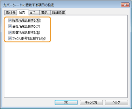 カバーシートにロゴまたは署名を付ける場合は、[ロゴをつける]または[署名をつける]にチェックマークを付けます。あらかじめロゴや署名として使うビットマップ形式のデータを用意しておく必要があります。
