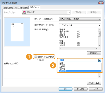 「至急」、「社外秘」などのマークをカバーシートに記載できます。リストから選ぶ代わりに、任意の文字を[ラベル]に直接入力することもできます。