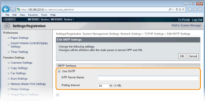 Simple Network Time Protocol (SNTP) enables you to adjust the system clock by using the time server on the network. The protocol is typically used for synchronizing the machine and a server, such as when the machine needs to access an LDAP server with the security authentication that was enabled. The time is adjusted based on Coordinated Universal Time (UTC), so specify the time zone setting before configuring SNTP (Date/Time Settings). SNTP settings can be specified via the Remote UI.