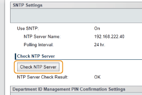[Network Settings] [TCP/IP Settings] and click [Check NTP Server] in [SNTP Settings]. If a proper connection has been established, the result is displayed as shown below. Note that this operation does not adjust the system clock.![]() |