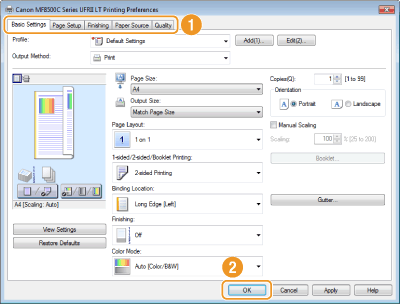 Click the [Basic Settings], [Page Setup], [Finishing], [Paper Source], or [Quality] tabs to specify the print settings on each screen as necessary.