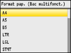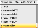 Si l'écran illustré ci-dessus ne s'affiche pas lorsque le papier est chargéSi vous chargez toujours le même papier dans la fente d'alimentation manuelle, vous pouvez ignorer les opérations des réglages papier en enregistrant le format et le type de papier comme réglages par défaut. Notez que si un réglage par défaut est mémorisé, l'écran illustré ci-dessus ne s'affiche pas. Pour afficher l'écran, sélectionnez <Non> pour <Enregistrer réglages par défaut> (Enregistrement des réglages papier par défaut pour l'utilisation de la fente d'alimentation manuelle).