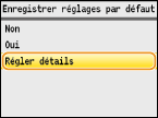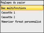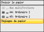 Une fois que les réglages par défaut concernant le papier sont enregistrés, l'écran de définition du papier ne s'affichent plus lorsque vous insérez du papier ; les mêmes réglages sont appliqués. Si vous utilisez un autre format ou un autre type de papier sans corriger les réglages papier, l'appareil n'imprimera pas le document correctement. Pour éviter ce problème, désactivez alors les réglages par défaut en sélectionnant <Non> à l'étape 3 et chargez ensuite le papier.