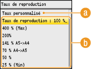 Vous agrandissez ou réduisez les copies en appliquant un taux de reproduction prédéfini, <A5->A4> par exemple, ou en définissent un taux de reproduction personnalisé par incréments de 1 %.