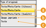 Vous pouvez sélectionner la qualité d'image optimale de la copie selon le type de document (document texte, documents comportant des diagrammes ou des graphiques ou photos de magazine, par exemple).