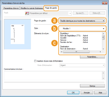 Vous pouvez joindre une page de garde au document que vous envoyez. Sélectionnez une page de garde parmi les trois modèles de pages de garde disponibles dans le pilote de fax ou créez la vôtre. Pour plus d'informations, cliquez sur [Aide] dans l'écran du pilote de fax.