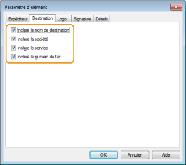 Sélectionnez les éléments relatifs au destinataire que vous voulez inclure et renseignez les informations. Le nom des destinataires, des entreprises, des services et les numéros de fax indiqués dans l'onglet [Paramètres d'envoi] (